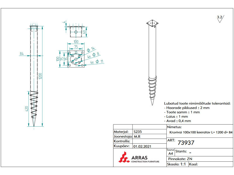Talajcsavar négyszögletű talpas fejjel 84x1200 - 100x100 fejméret